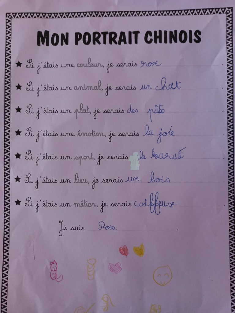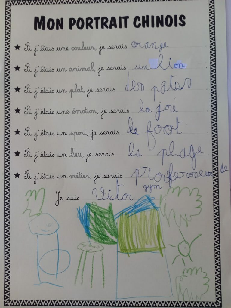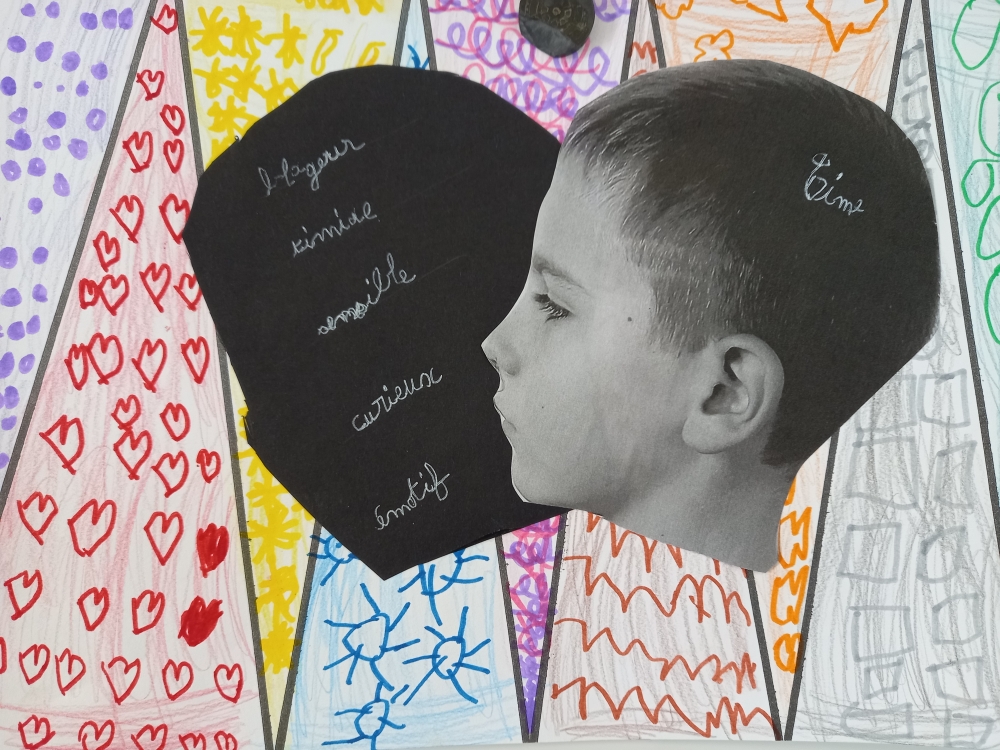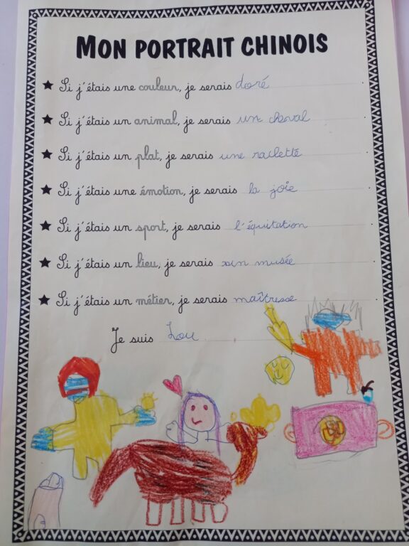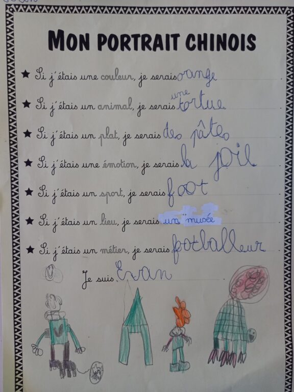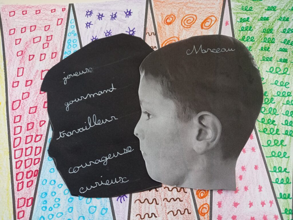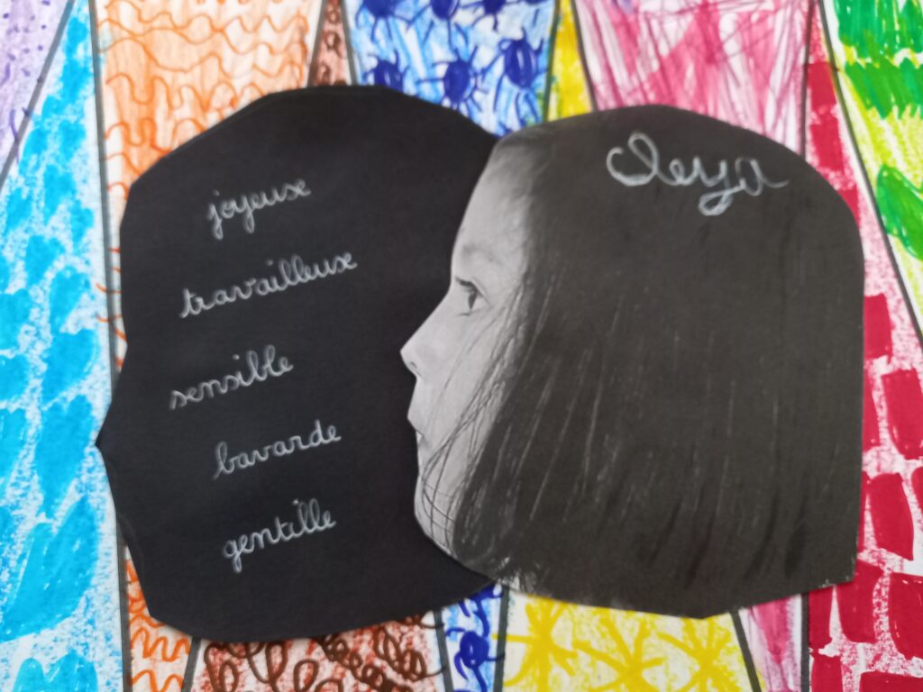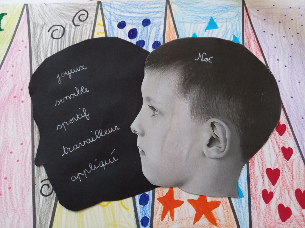 En ce début d’année scolaire, afin de mieux nous connaître les uns les autres, chacun de nous a écrit son portrait chinois et a décrit sa personnalité à l’aide de cinq adjectifs qualificatifs que nous avons ensuite mis en valeur à travers une réalisation en arts plastiques. Voici en images, le résultat de quelques unes de nos productions littéraire et artistique :