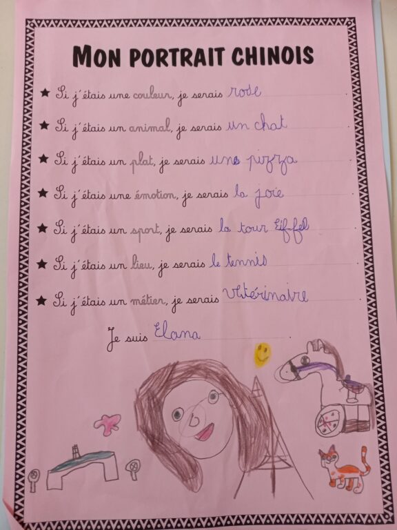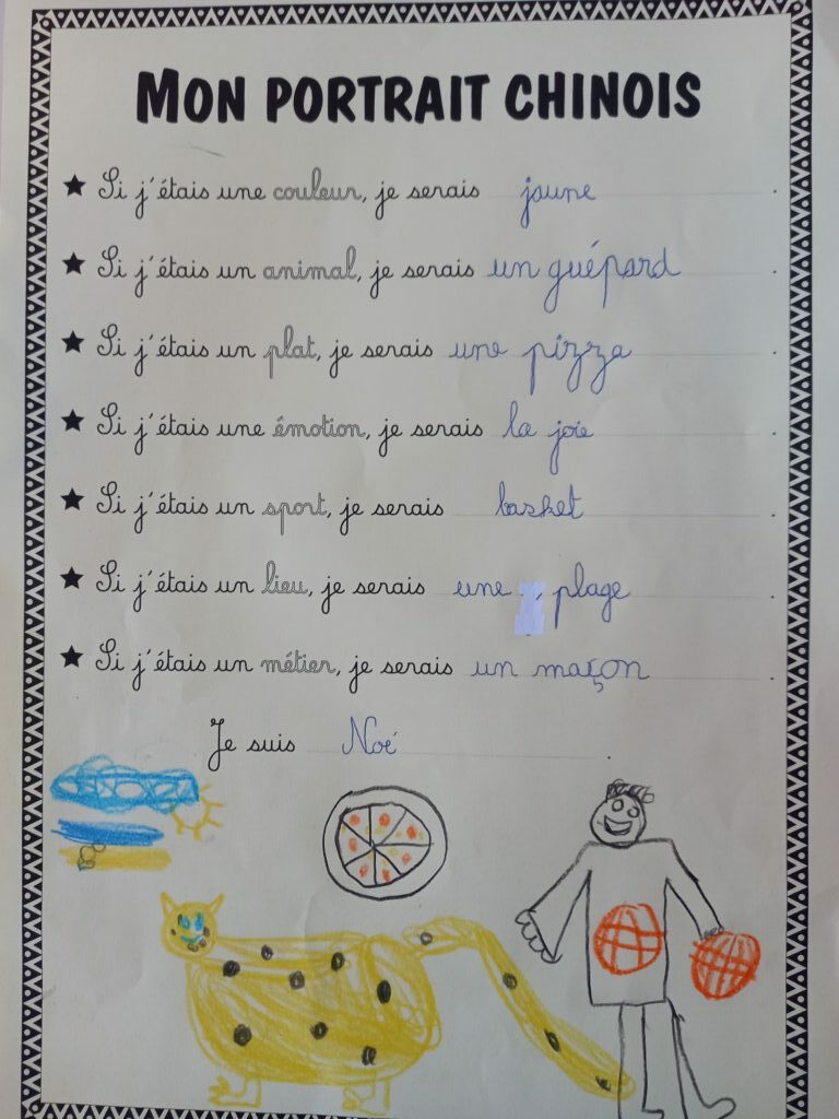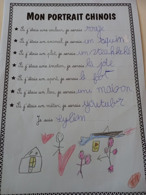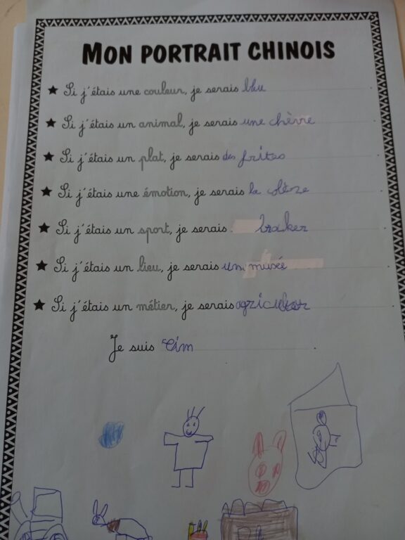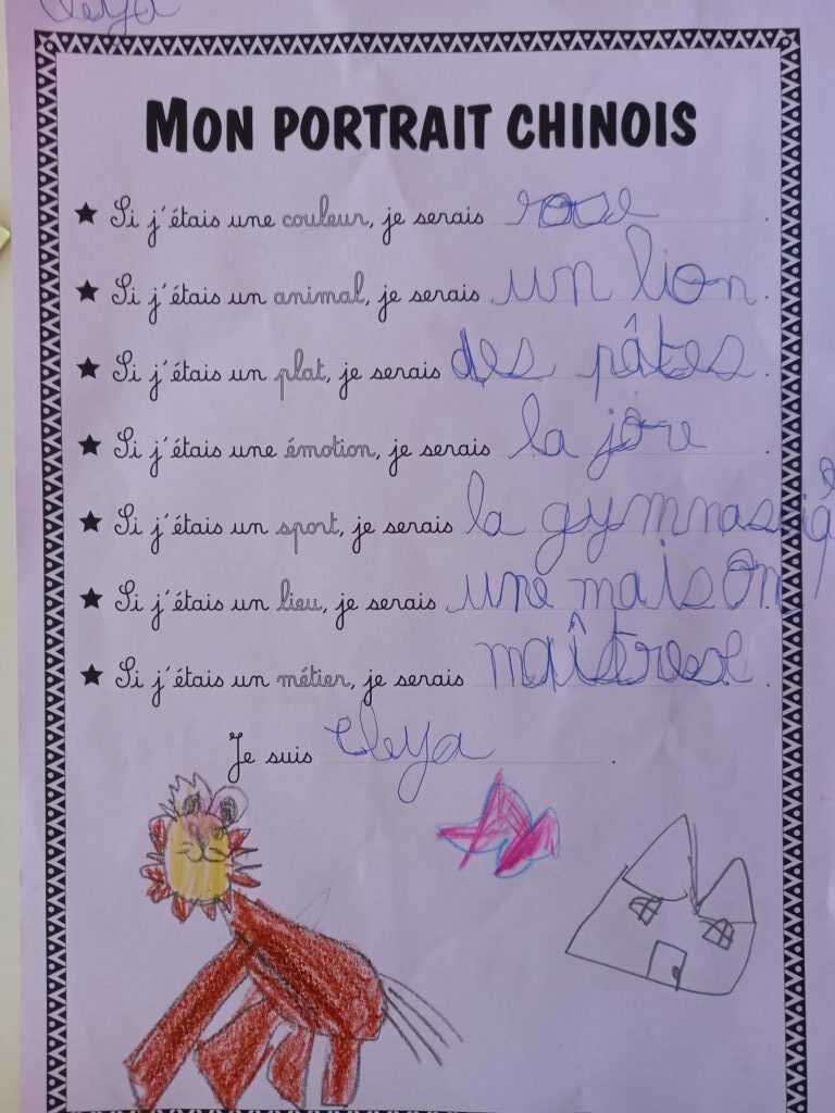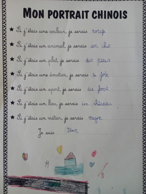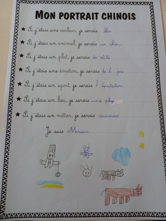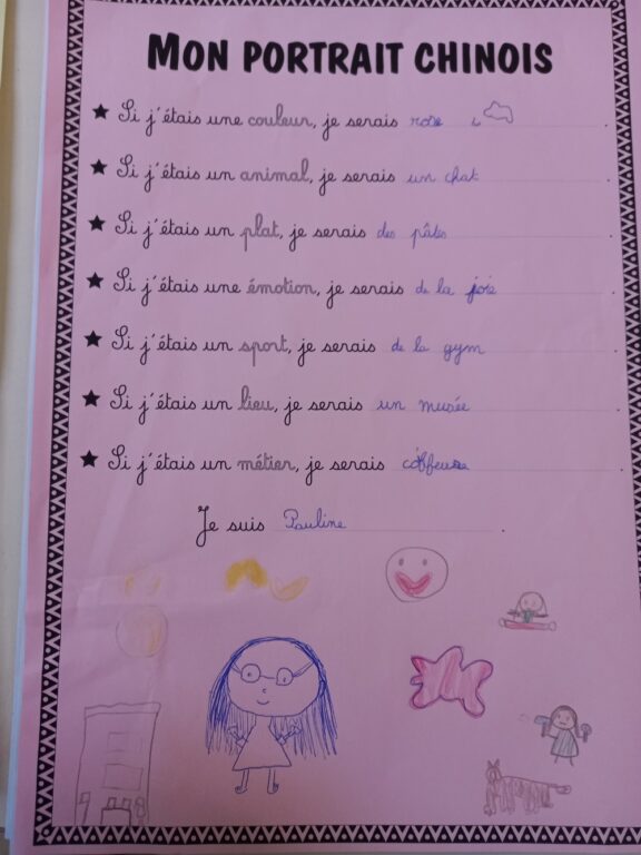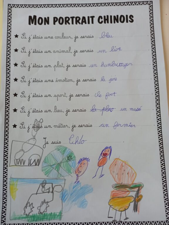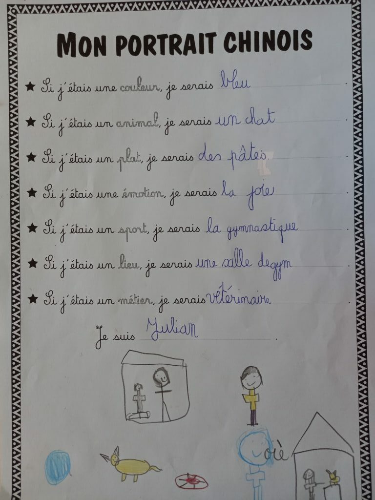 En ce début d’année scolaire, afin de mieux nous connaître les uns les autres, chacun de nous a écrit son portrait chinois et a décrit sa personnalité à l’aide de cinq adjectifs qualificatifs que nous avons ensuite mis en valeur à travers une réalisation en arts plastiques. Voici en images, le résultat de quelques unes de nos productions littéraire et artistique :