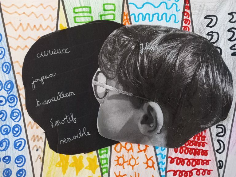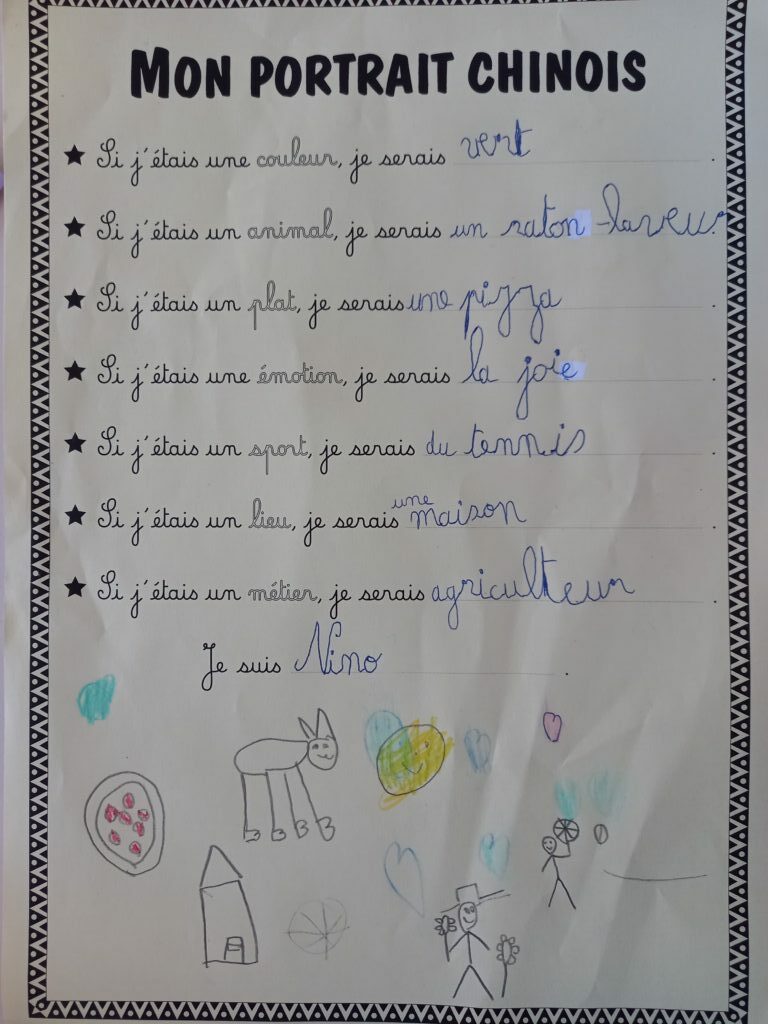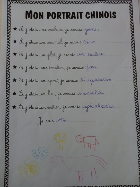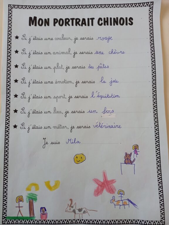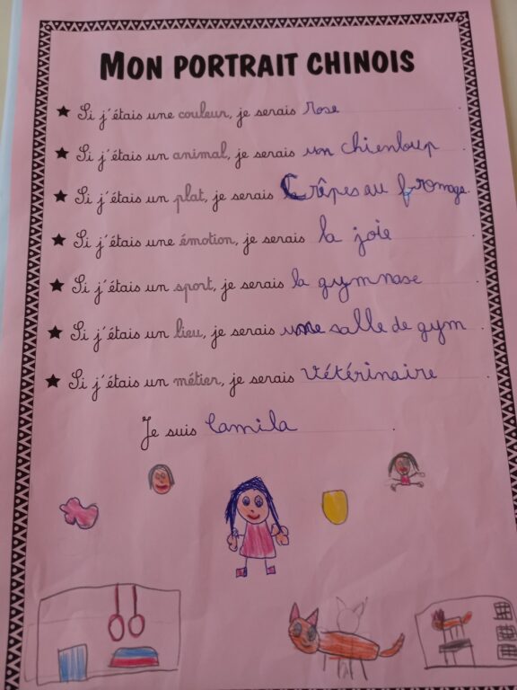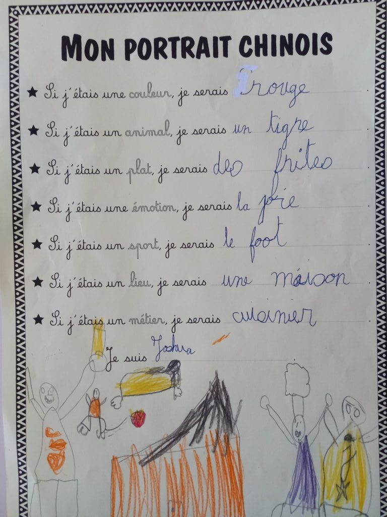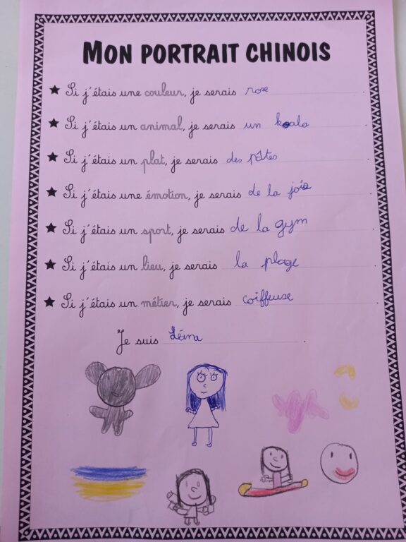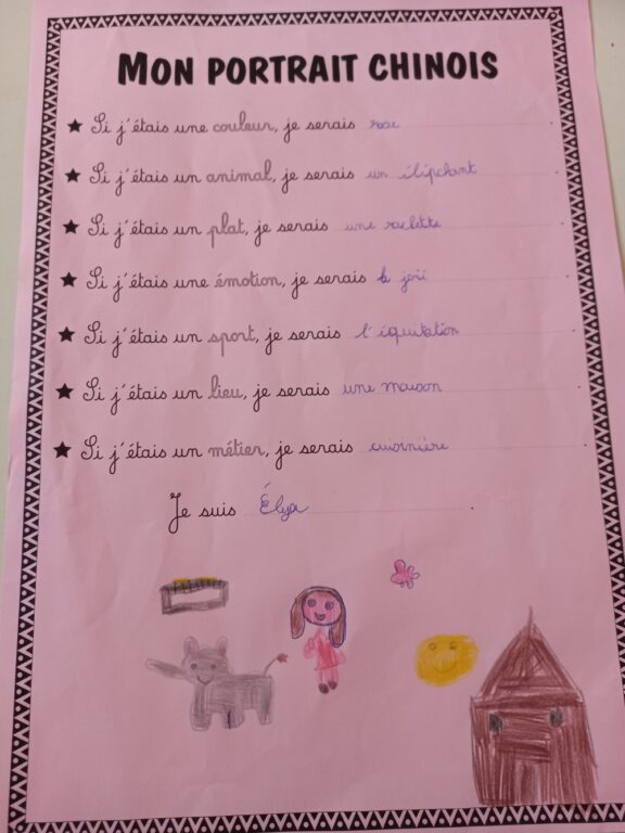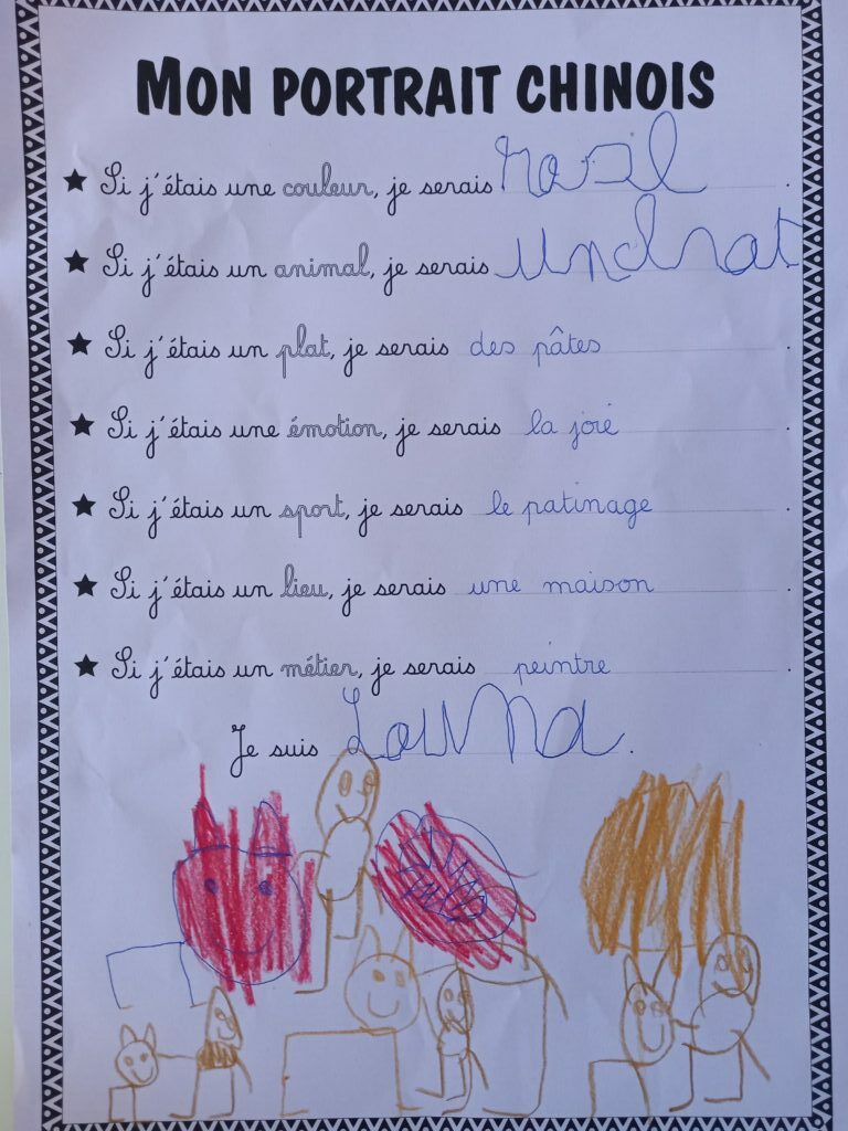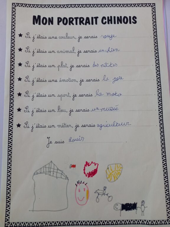 En ce début d’année scolaire, afin de mieux nous connaître les uns les autres, chacun de nous a écrit son portrait chinois et a décrit sa personnalité à l’aide de cinq adjectifs qualificatifs que nous avons ensuite mis en valeur à travers une réalisation en arts plastiques. Voici en images, le résultat de quelques unes de nos productions littéraire et artistique :